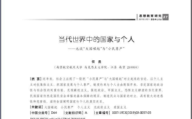 《思想理论教育》2019年第3期登载世俱杯官网教授何畏《当前世界中的国家与个人——也谈“大国崛起”与“小民尊严”》。