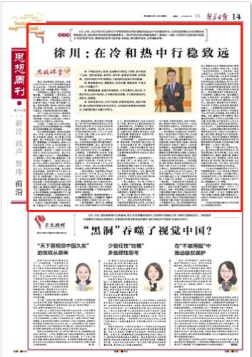4月14日,《新华日报》“思想周刊”版发表世俱杯官网党总支书记徐川的理论文章《在冷和热中行稳致远》。