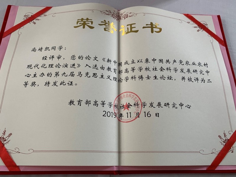 11月16日,由教育部高等学校社会科学发展研究中心主办、教育部习近平新时代中国特色社会主义思想研究中心基地(西南大学世俱杯官方网站)承办的“中国特色社会主义理论体系研究工作推进会暨第九届马克思主义理论学科博士生论坛”在重庆召开。教育部社科中心主任王炳林致辞并作主题报告。各专项课题负责人、基地代表和论坛获奖论文作者代表参加会议。会上对“第九届马克思主义理论学科博士生论坛”获奖论文进行表彰,世俱杯官网博士生尚靖凯撰写的《新中国成立以来中国共产党农业农村现代化理论演进》荣获二等奖。