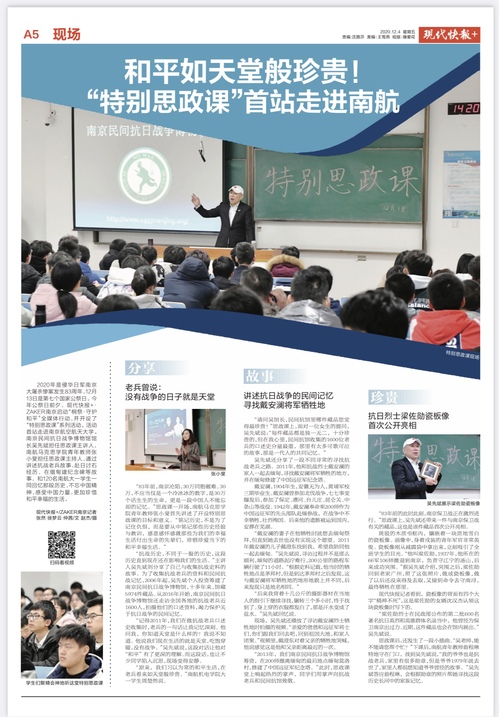 2020 年,是侵华日军南京大屠杀 83 周年,12 月 13 日,是第 7 个国家公祭日。今年公祭日前夕,现代快报 +•ZAKER 南京启动“桐祭 • 守护和平“全媒体行动,并开设了“特别思政课“系列活动。活动首站走进了世俱杯官方网站。南京民间抗日战争博物馆馆长吴先斌担任思政课主讲人,南航马克思学院青年教师张小斐担任思政课主持人。通过讲述抗战老兵故事、赴日讨石经历、在缅甸建纪念碑等故事,和 120 名南航大一学生一同回忆那段历史,不忘中国精神,感受中国力量,更加珍惜当下的和平幸福生活。