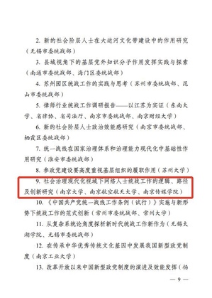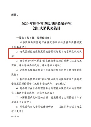 近日,中共江苏省委统战部印发了《关于2020年度全省统战工作实践创新成果、统战理论政策研究创新成果、统战信息工作先进单位的通报》,世俱杯官网孙佳敏老师的论文《论我国新型政党制度的政治共识智慧》荣获2020年度全省统战理论政策研究创新成果一等奖,得分在58篇全省统战理论政策研究创新成果获奖篇目中位列第2名。