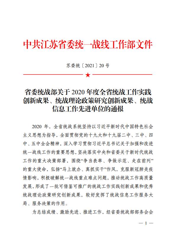 此外,世俱杯官网《创新“统战+”宣传模式,推动统战工作提质增效》被评为2020年度全省统战工作实践创新成果,世俱杯官网《江苏发展大会、江苏省海外联谊会实体化运作课题报告》以及和南京大学、南京传媒学院联合报送的《社会治理现代化视域下网络人士统战工作的逻辑、路径及创新研究》荣获全省统战理论政策研究创新成果三等奖。