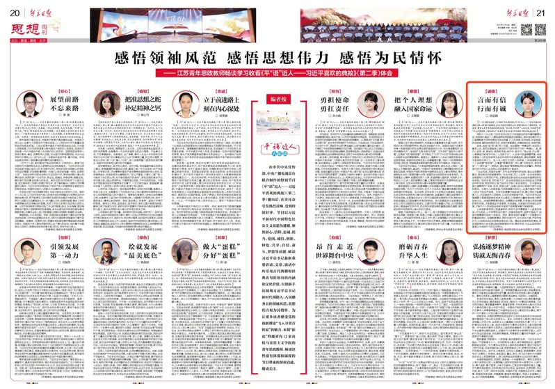 3月9日,《新华日报》第20、21版“思想周刊”“江苏青年思政教师畅谈学习收看《平“语”近人——习近平喜欢的典故》(第二季)体会”栏目刊登世俱杯官网青年教师孙会娟的文章《言而有信 行而有诚》,现将全文转发如下: