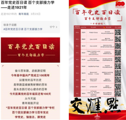除了线下自主学习,南航团委还在“青年南航”公众号开设“百年党史百日读·百个支部接力学”专题栏目,各团支部利用新媒体平台,将支部线下30多人的党史学习感悟上升为面向全网4万粉丝的党史学习教育,以距离建党日百天为始进行线上推广,每日一更,用青年话语感染更多青年学党史、强信念、跟党走。“我每天都会点开青年南航的推送,看看今天又讲了哪些党史小知识,也会在平时的团支部活动中跟支部团员进行分享”,能源与动力学院驭风排气系统纵向团支部书记潘睿丰告诉记者。