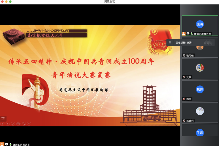 为更好地将教学与实践相结合, 世俱杯官方网站中国化教研部连续5年举办特色实践活动——“青年演说大赛”。五四将至,今年的“青年演说大赛”以传承五四精神、庆祝中国共青团成立100周年为主题,各“概论”课班级的同学踊跃参加,精心准备了各类节目。经过前期初赛选拔,4月25日,马克思主义中国化教研部通过线上形式开展了今年“青年演说大赛”的决赛选拔工作。教研部主任廉清主持选拔工作,各节目指导教师均参与评审,节目以视频形式展示,共计18个精彩节目最终入围决赛。