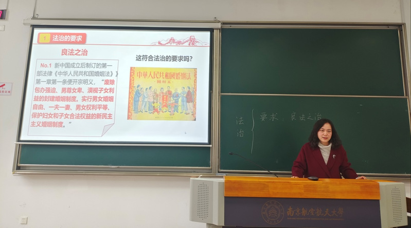 朱晓敏老师以国庆七十周年花车为导入引出“民主与法治”的主题,以“陆勇案”为话题层层深入,探讨“民主与法治的关系”。在此基础上讲解法治的要求与法治的意义,最后通过2022年“新时代推动法治进程十大案件”延伸到全面推进依法治国的总目标。朱晓敏老师在课堂设置中积极引导学生思考与探究,理论与实践相结合,将学生的困惑与思考剥丝抽茧,讲授言近旨远。