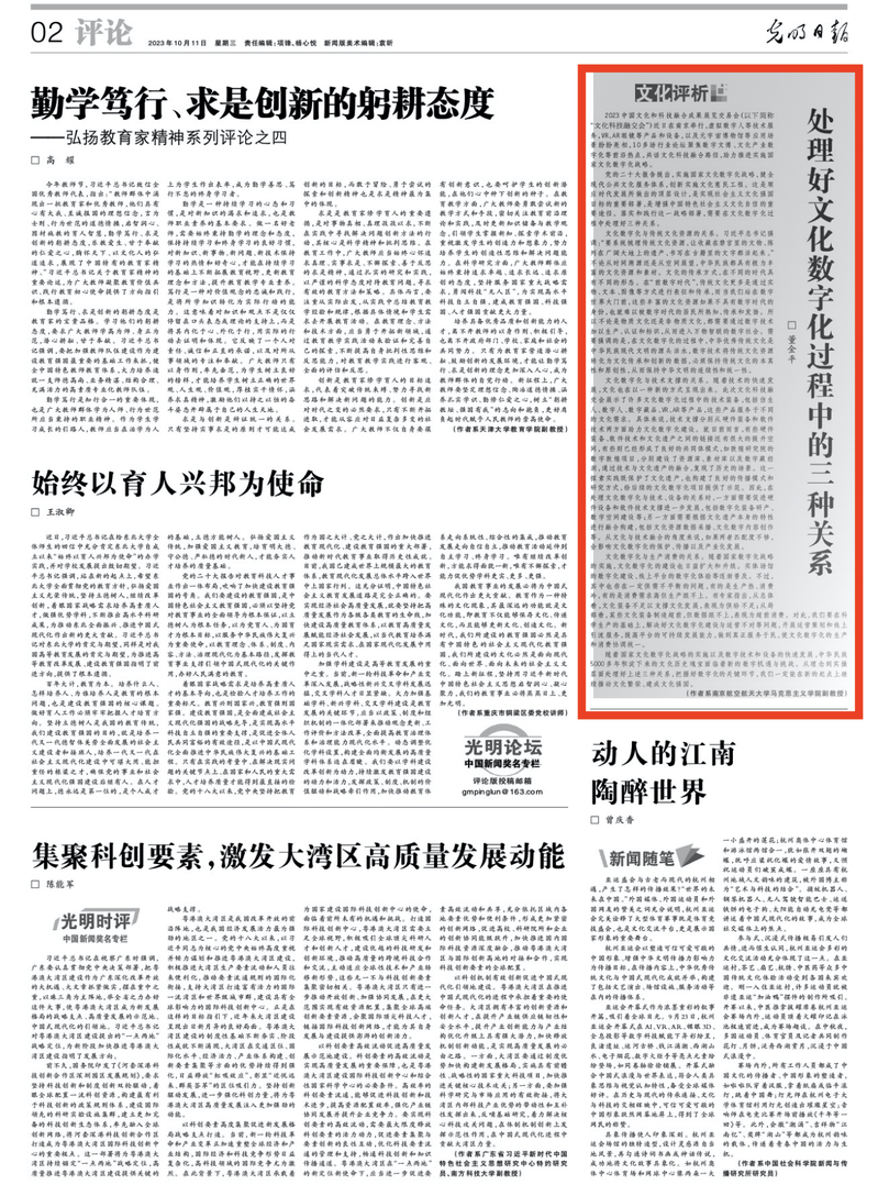 10月11日,《光明日报》第02版刊发了世俱杯官网董金平副教授的文章《处理好文化数字化过程中的三种关系》,现将全文转发如下: