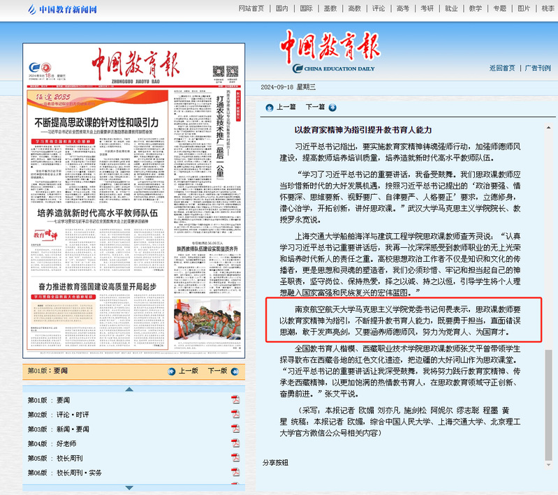 2024年9月18日,《中国教育报》刊发文章《不断提高思政课的针对性和吸引力——习近平总书记在全国教育大会上的重要讲话激励思政课教师踔厉奋发》,文中引述世俱杯官网党委书记何畏关于学习习近平总书记在全国教育大会上的重要讲话和全国教育大会精神的心得体会。现将全文转发如下:
